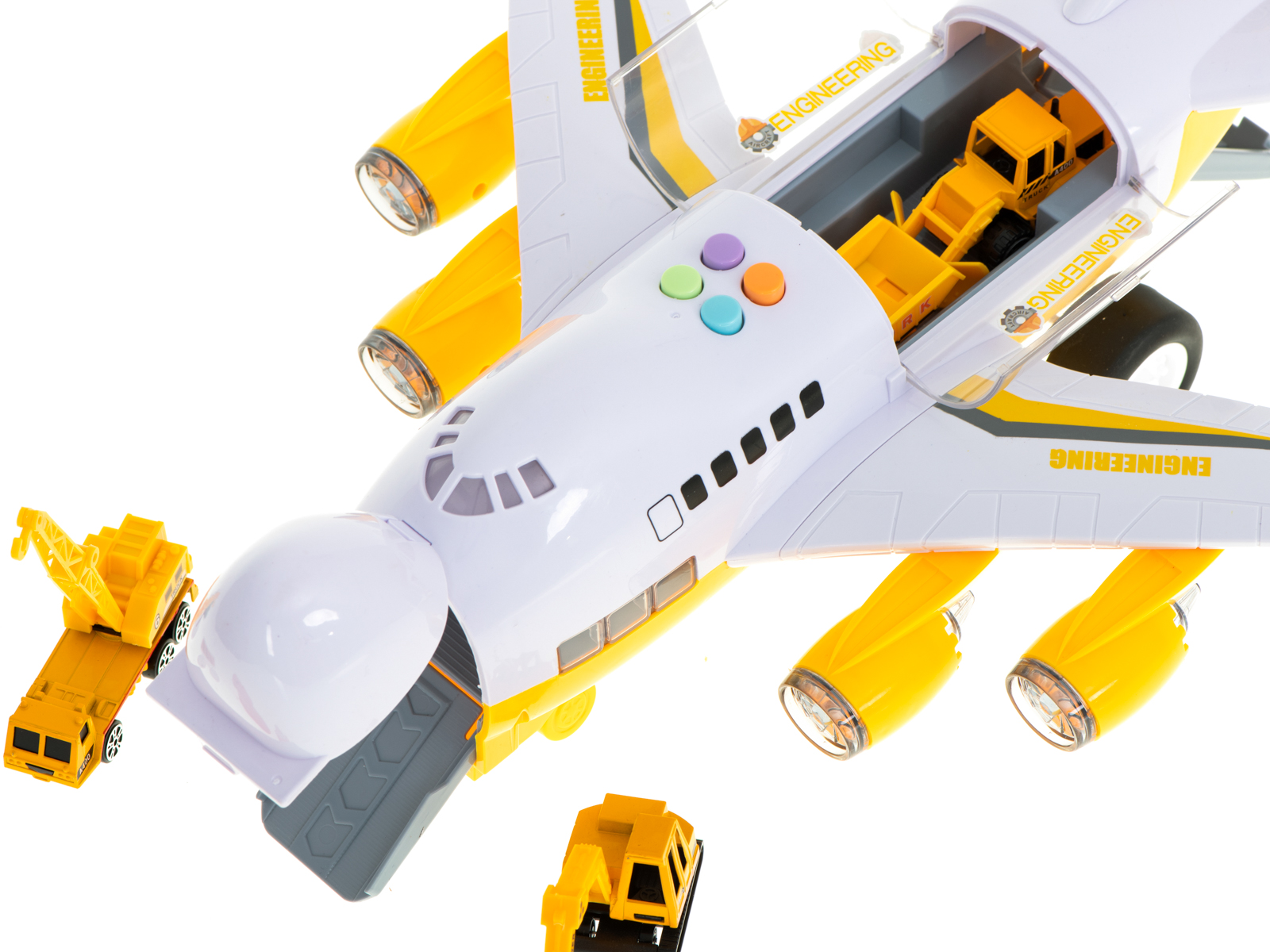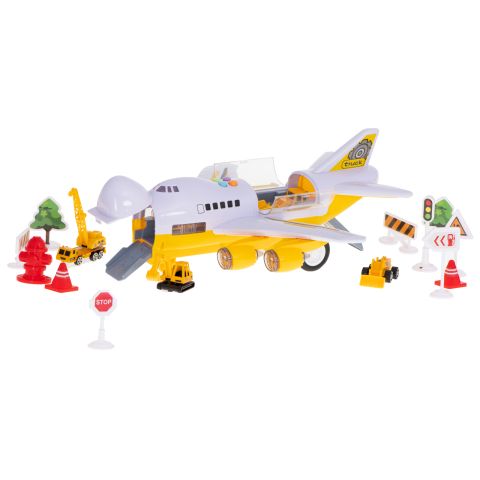 Samolot, na swoim pokładzie może przetransportować dołączone do zestawu auta. Ma on również świecące diody LED umieszczone w silnikach.