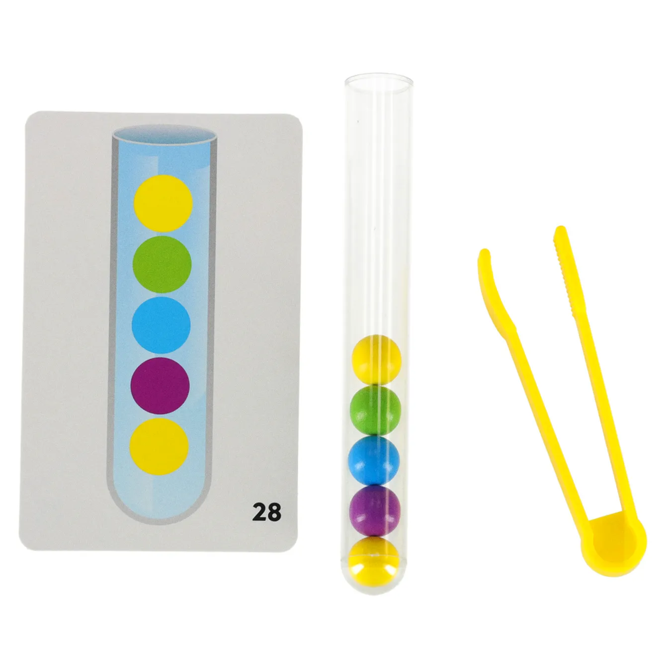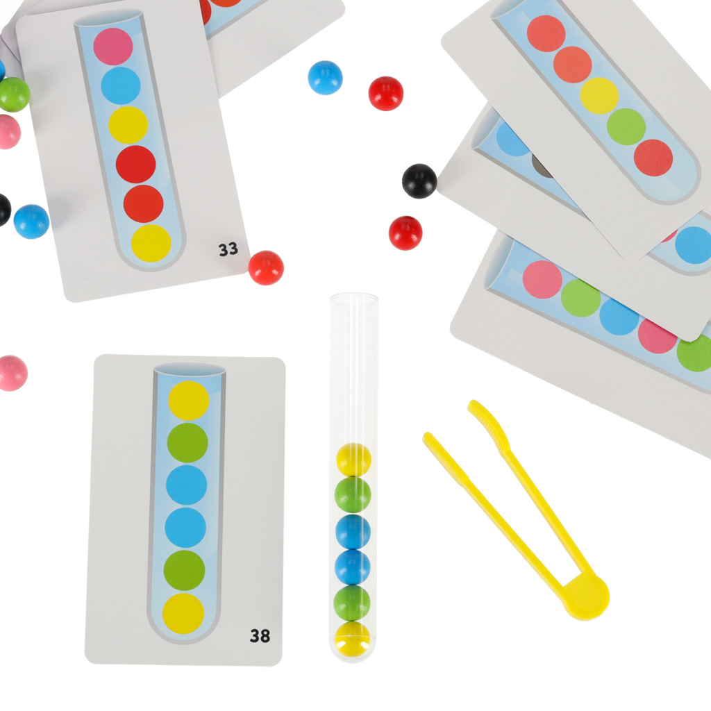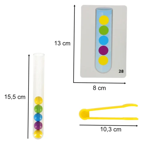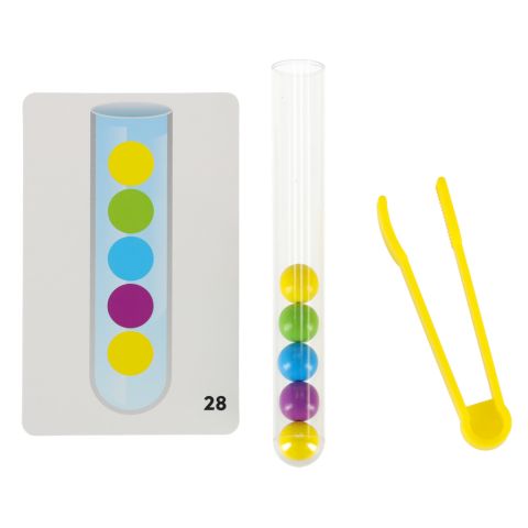 Głównym celem zabawy jest sortowanie kuleczek do odpowiednich próbówek! Maluch może to robić używając dłoni lub dołączonych do zestawu szczypiec!