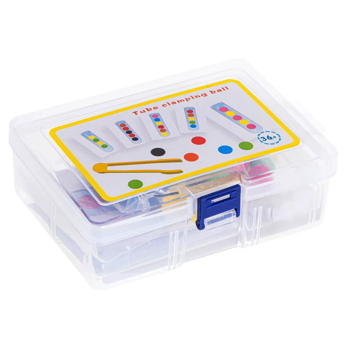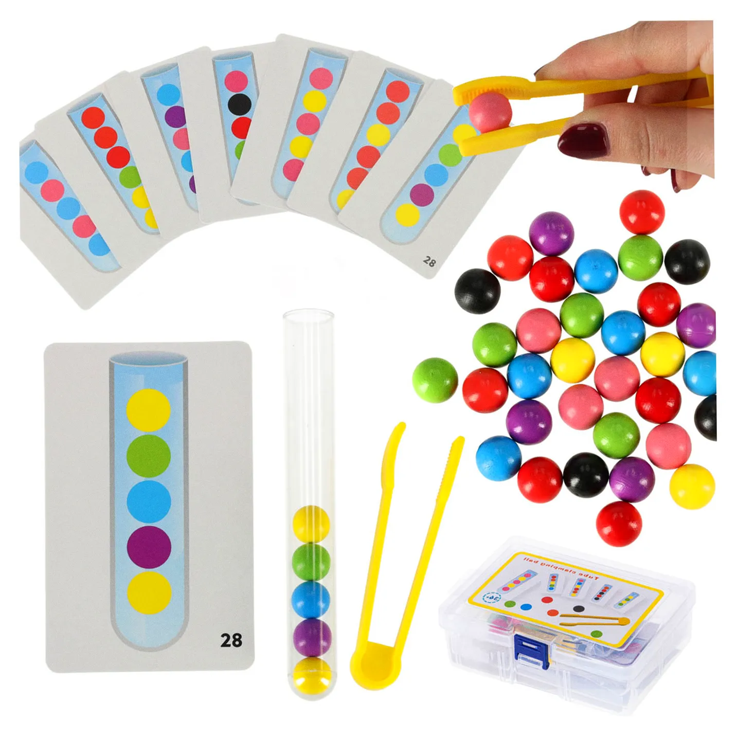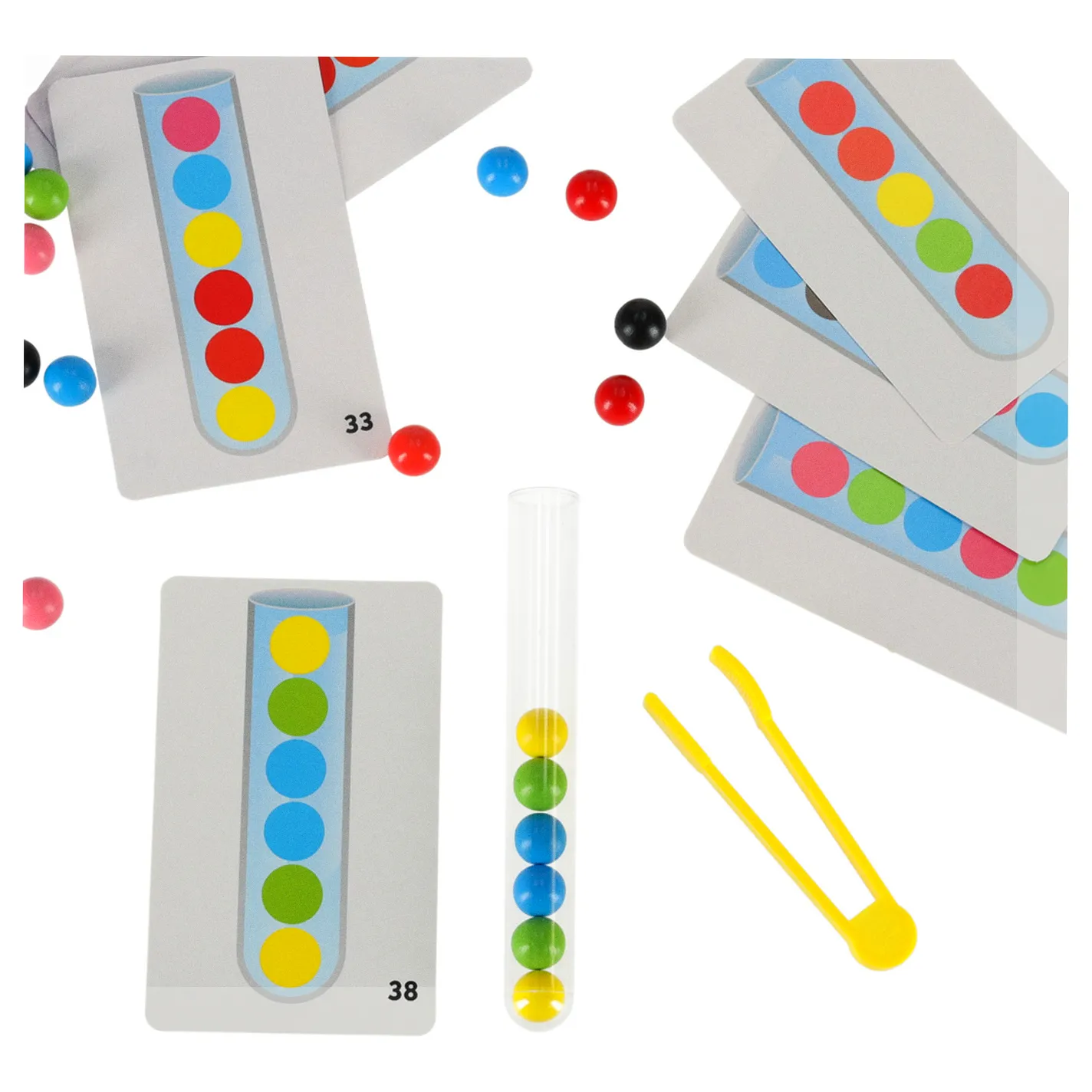 Głównym celem zabawy jest sortowanie kuleczek do odpowiednich próbówek! Maluch może to robić używając dłoni lub dołączonych do zestawu szczypiec!