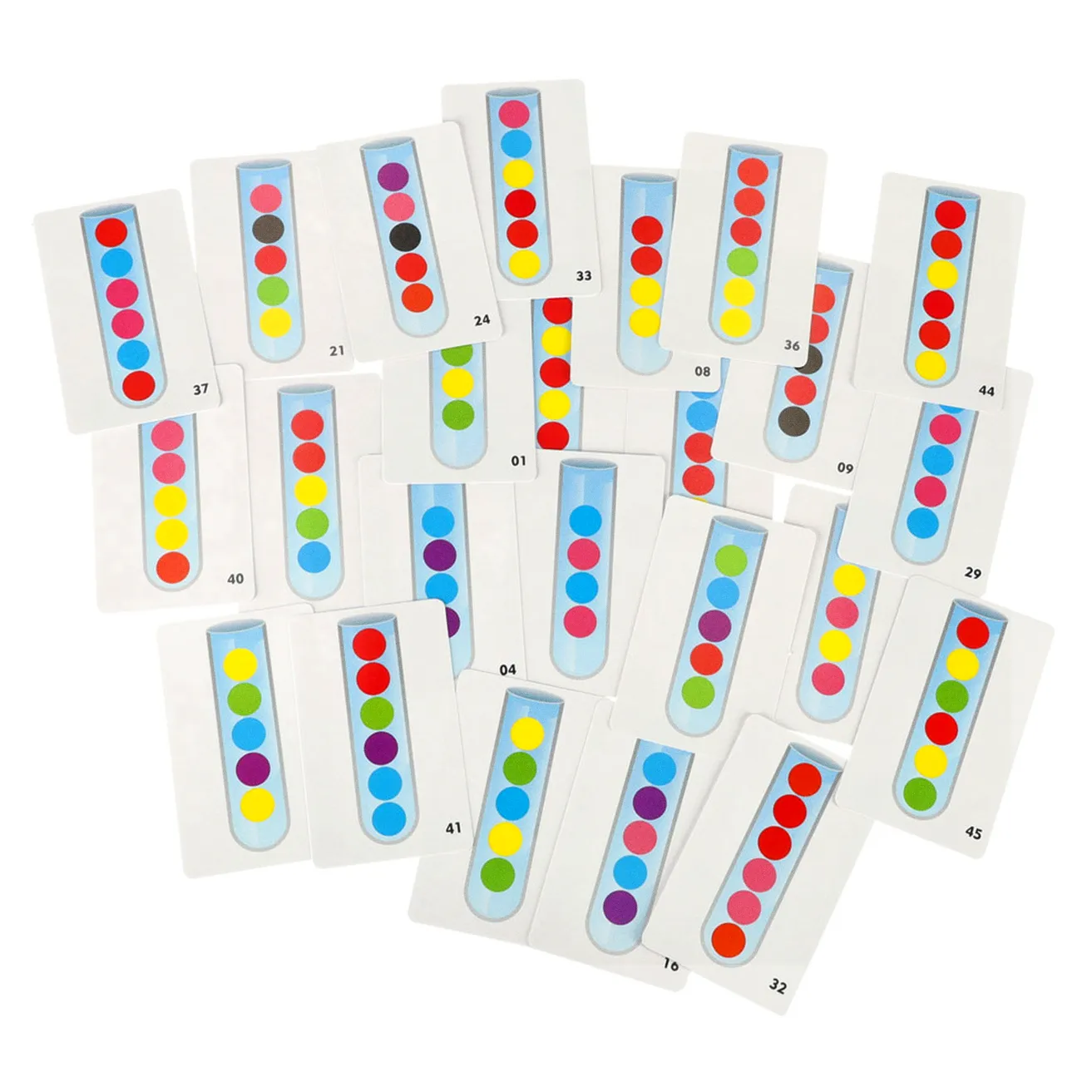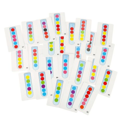 24 dwustronne karty zapewnią inspirację. Przedstawiają wzory, jakie należy ułożyć w próbówce. Zadanie może wydawać się proste, ale z początku na pewno będzie stanowić nie lada wyzwanie!