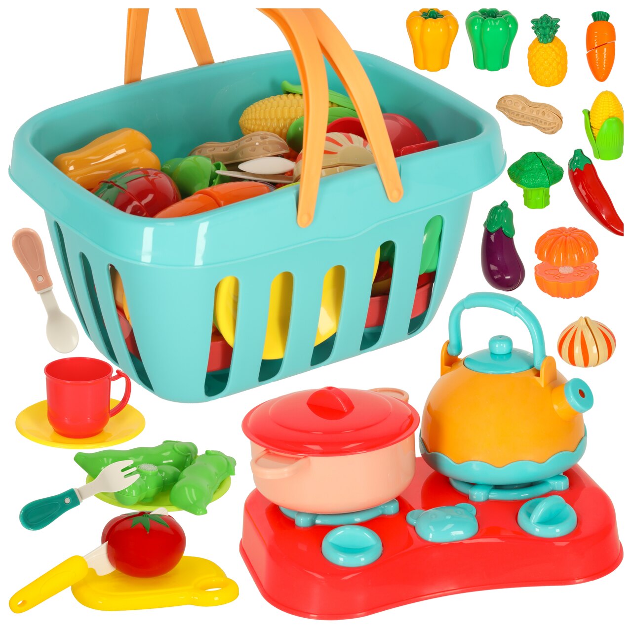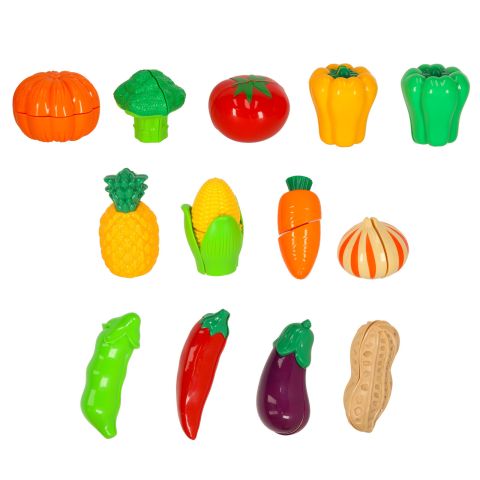 - Ilość elementów w zestawie: 28 (13 warzyw i owoców do krojenia z segmentami łączonymi na rzepy + 15 elementów zastawy kuchennej)