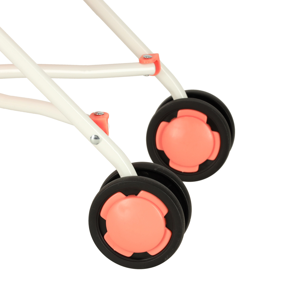 Cztery stabilne kółka pozwalają na płynne manewrowanie, a miękkie piankowe uchwyty zwiększają komfort użytkowania. Składana konstrukcja umożliwia szybkie złożenie do kompaktowego rozmiaru, co ułatwia przechowywanie i transport. Praktyczna siateczkowa torba na drobiazgi dodaje realizmu zabawie. Wózek wspiera rozwój wyobraźni, empatii i umiejętności społecznych, oferując dziecku wiele godzin twórczej rozrywki.