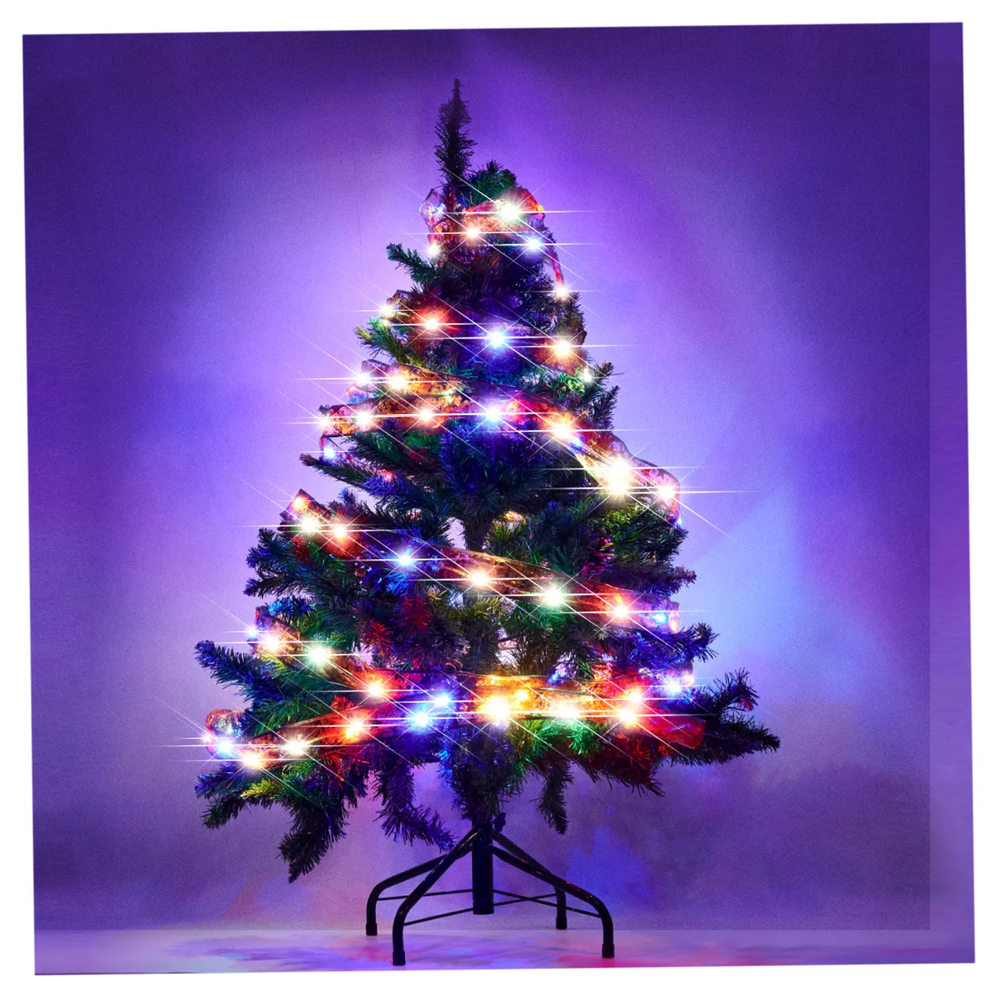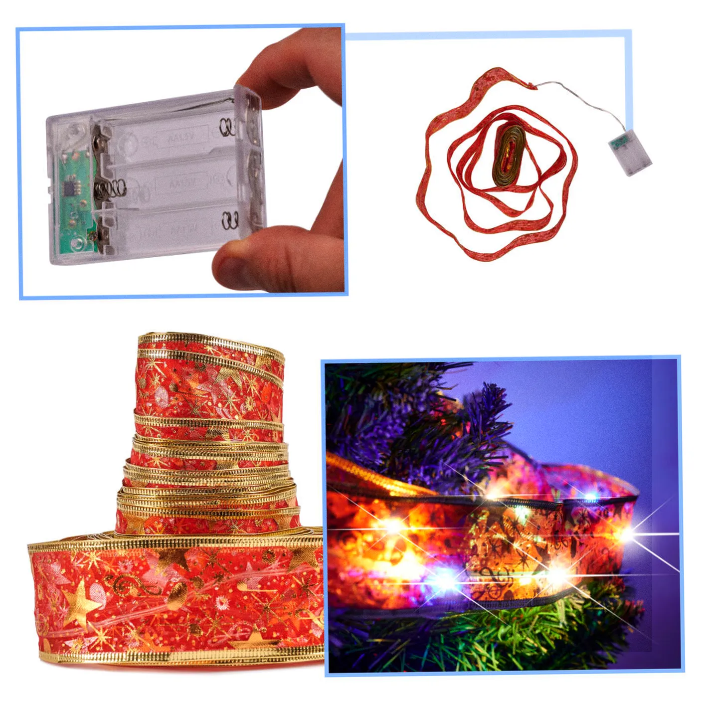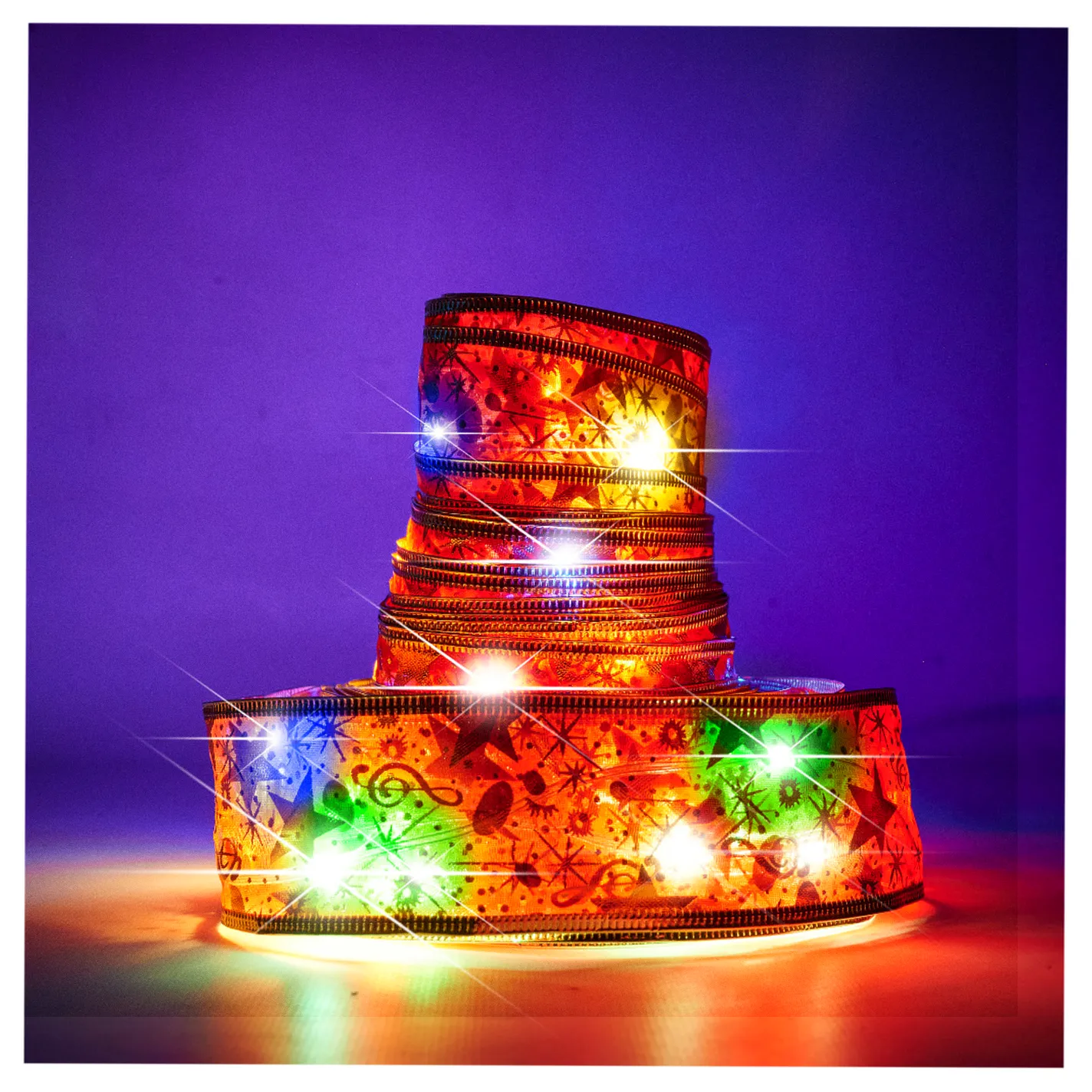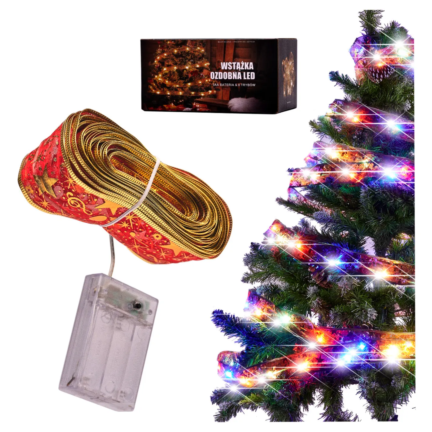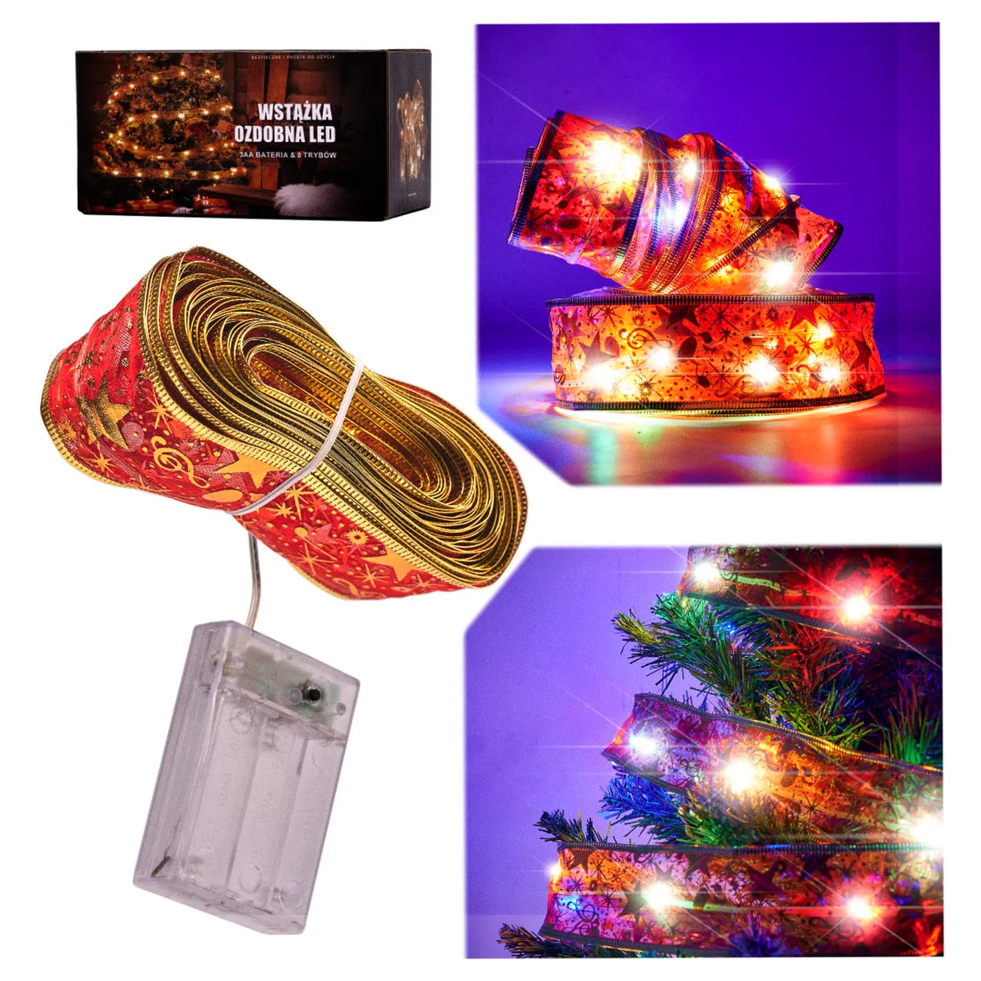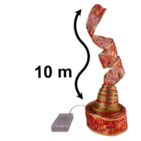 Świąteczna wstążka LED na choinkę. Nada świątecznego charakteru każdemu wnętrzu! 8 trybów świecenia. Zasilanie: 3 baterie AA. Kolor: wstążka – czerwony, lampki – multikolor. Ilość lampek: 100LED. Długość: 10m.