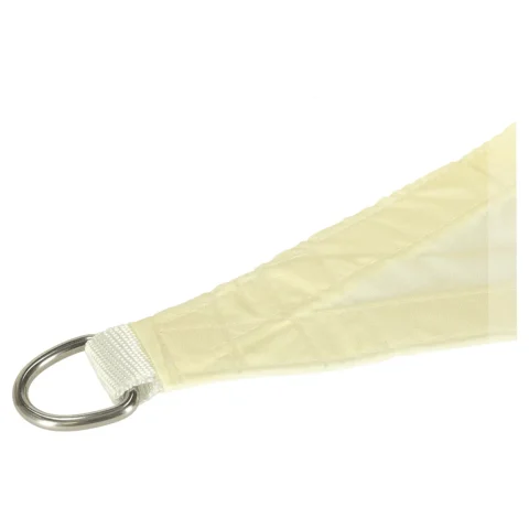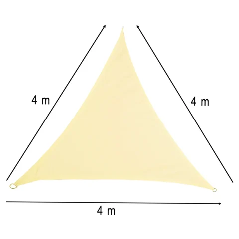 Trójkątny żagiel przeciwsłoneczny 4×4×4 m z tkaniny PU Oxford 120 g/m2 chroni przed słońcem, UV i lekkim deszczem. Beżowy kolor, wodoodporność 400 mm H2O, filtr UV, wzmocnione brzegi i 3 stalowe uchwyty D-ring zapewniają trwałość i wygodę.