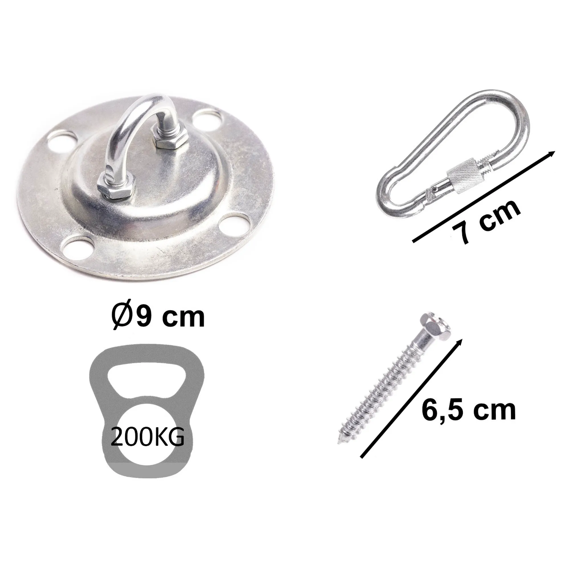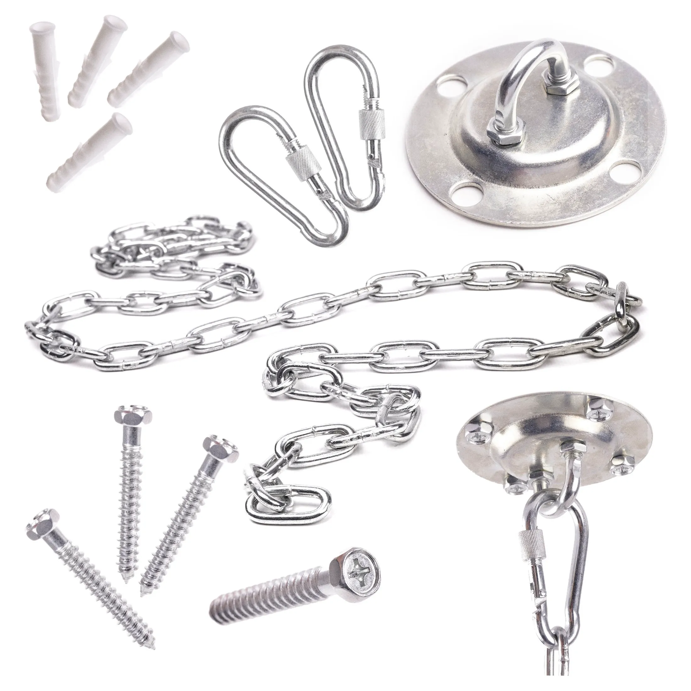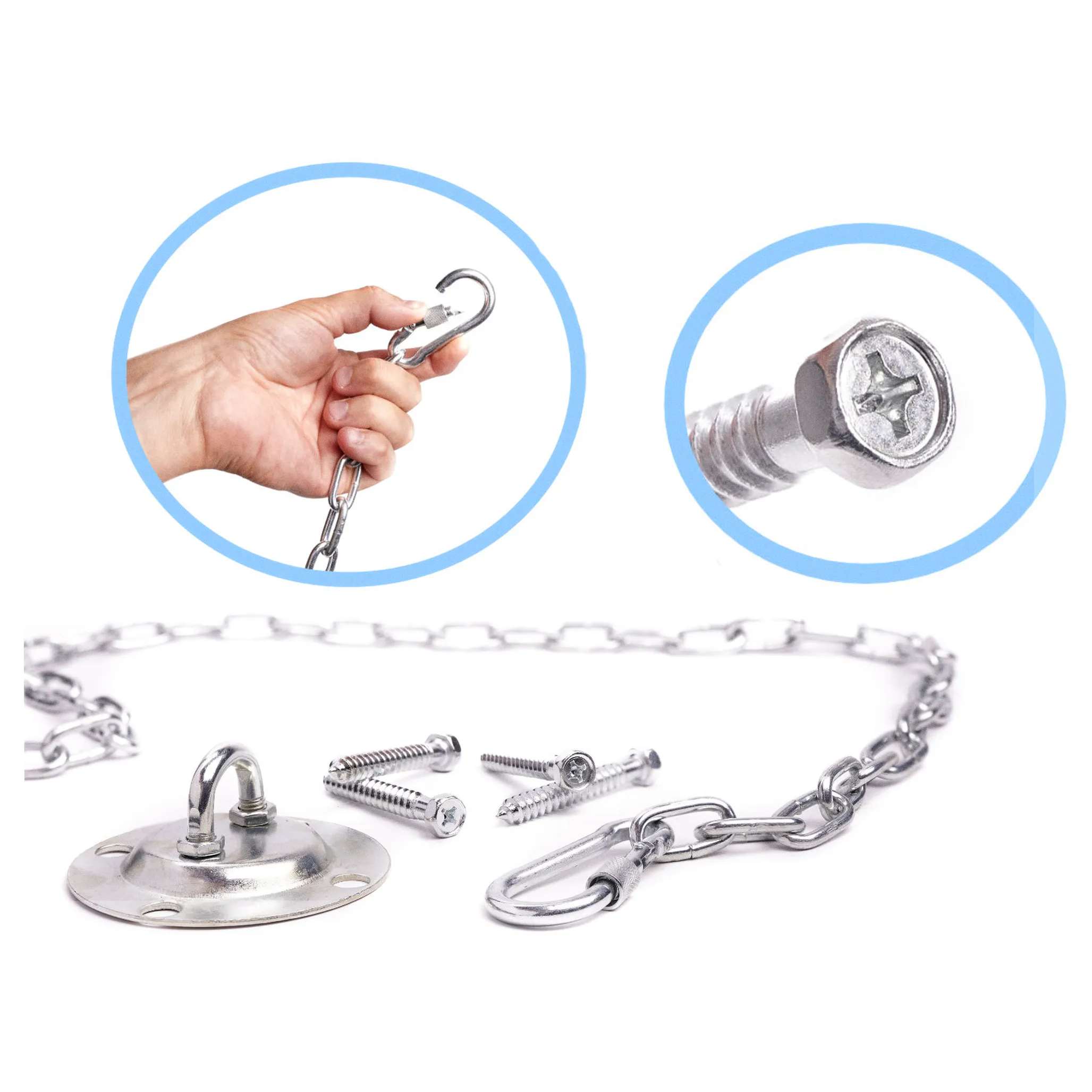 Zestaw sufitowy do montażu huśtawek. Posiada możliwość regulacji wysokości zawieszenia siedziska. W zestawie: okrągły hak sufitowy, dwa karabińczyki, łańcuch, śruby montażowe. Udźwig: do 200 kg. Tworzywo: stal. Dł. łańcucha: 150cm. Pręt ogniwa śr. 0,4cm.