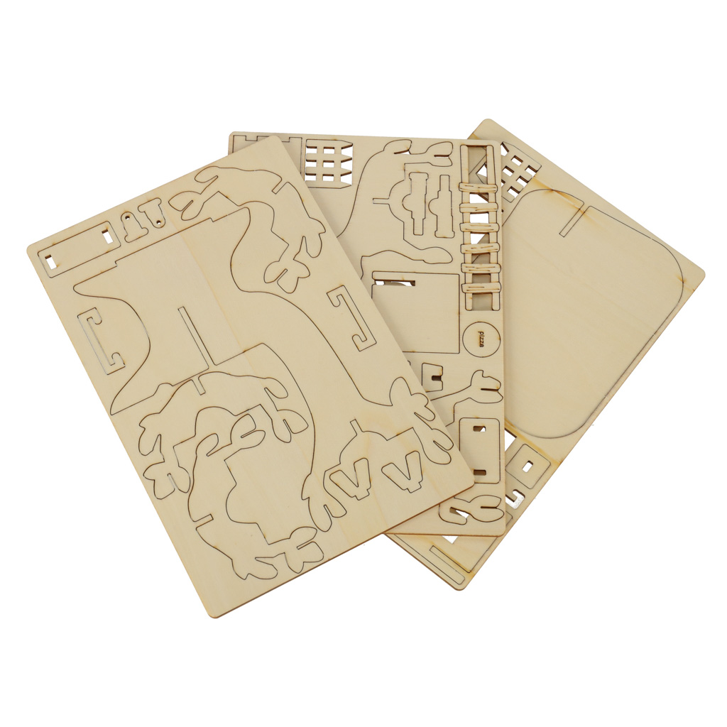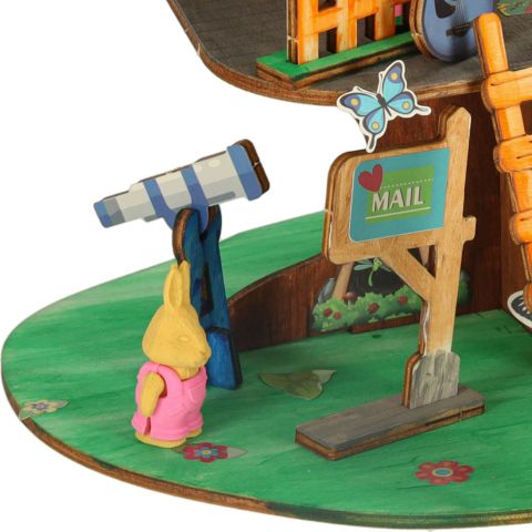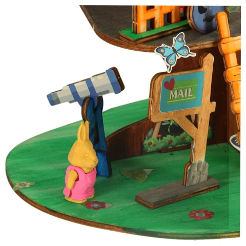 W zestawie znajdują się drewniane elementy, które należy połączyć, tworząc stabilny domek. Dołączone kolorowe farby pozwalają na pełną personalizację drewnianej konstrukcji. Cztery kolorowe figurki dodają uroku całej scenerii i inspirują do tworzenia unikalnych, kreatywnych opowieści, w których domek na drzewie zyskuje wyjątkowych mieszkańców.