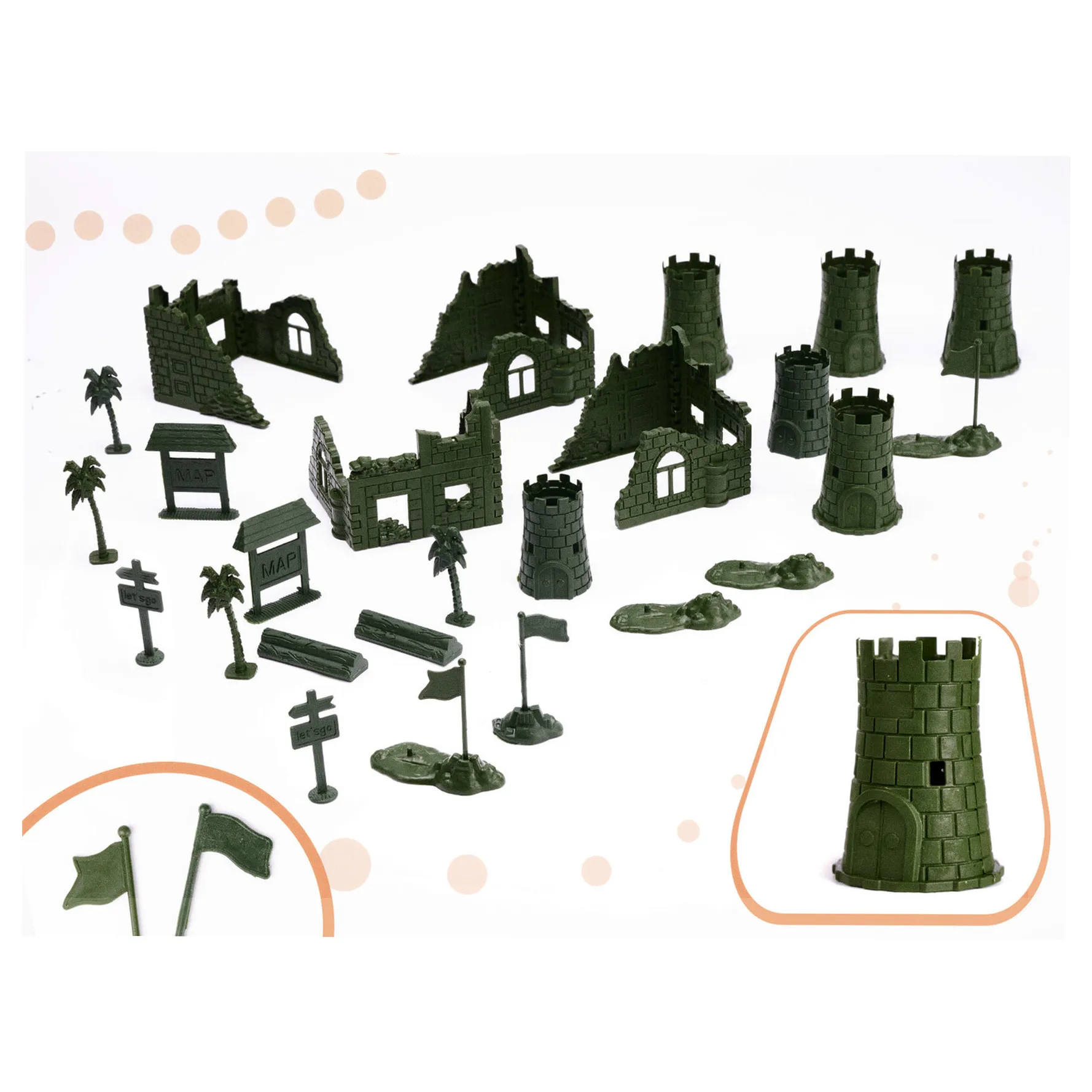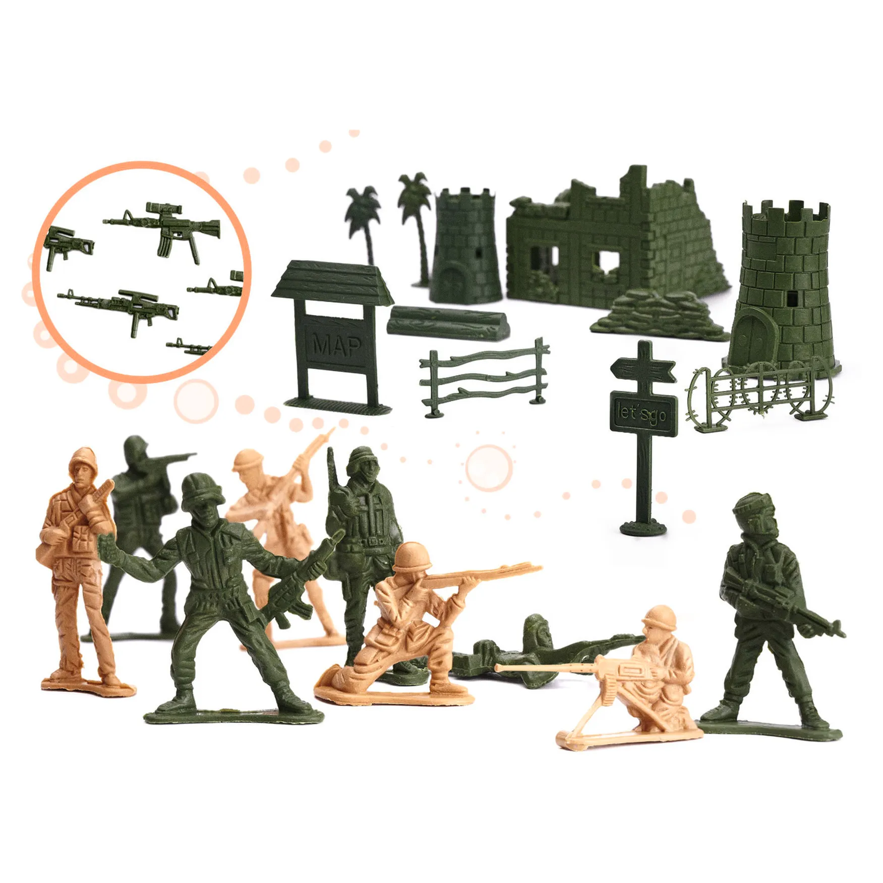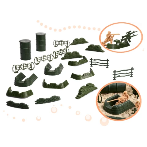 Rewelacyjny zestaw figurek do bazy wojskowej. Prawdziwa gratka dla miłośników wojska. Idealnie nada się dla dzieci kreatywnych o dużej wyobraźni. W zestawie 114 elem.: ok. 60 żołnierzyków i elementy do stworzenia bazy wojskowej. Wys. żołnierzyka: 5cm.